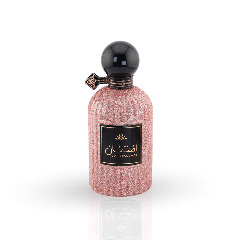 Eftinaan by Ard Al Zaafaran is a captivating 100ml Eau de Parfum presented in a spectacular rose gold glitter-textured bottle with elegant black sphere cap and rose gold accents. This enchanting fragrance opens with exotic lychee and bright bergamot, blooms into luxurious rose and sweet almond heart, and settles into creamy vanilla, sensual musk, and warm amber depths. The matching rose gold shimmer packaging creates glamorous, gift-worthy presentation. Perfect for those seeking feminine gourmand fragrances with fruity-floral elegance and exceptional longevity, Eftinaan delivers sparkling sophistication and radiant warmth. This dazzling composition captures modern femininity with timeless grace, making unforgettable impressions through its unique lychee-rose-vanilla harmony and stunning visual appeal.