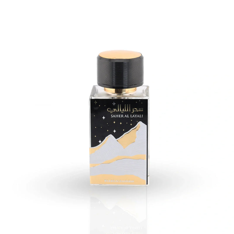Saher Al Layali Eau de Parfum by Ard Al Zaafaran captures the mystical charm of Arabian nights in a luxurious blend of apple, pink pepper, and lavender. The fragrance opens with fruity-spicy notes that lead to a heart of pineapple and soft florals, resting on a warm base of amber, leather, patchouli, and vanilla. Encased in a gold-and-silver detailed bottle, this perfume embodies both opulence and allure. Perfect for day or night, Saher Al Layali is a long-lasting, unisex scent that defines sophistication. Shop now and embrace the magic of the night.